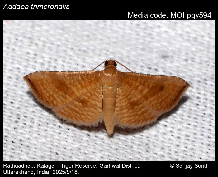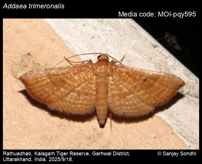 Anonymous 2025. Addaea trimeronalis (Walker, 1859) – . In Sondhi, S., R.P. Singh, G. Iyer, J. D'silva and K. Kunte (Chief Editors). Butterflies of India, v. 4.11. Published by the Indian Foundation for Butterflies. URL: https://www.mothsofindia.org/Addaea-trimeronalis, accessed 2025/10/18.