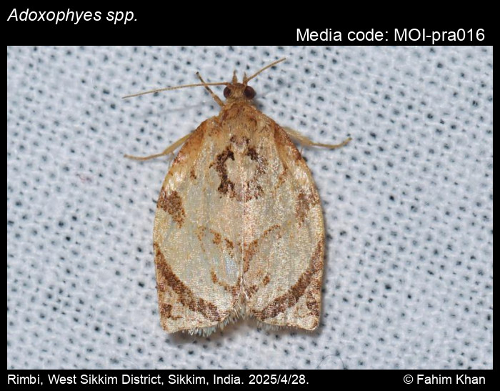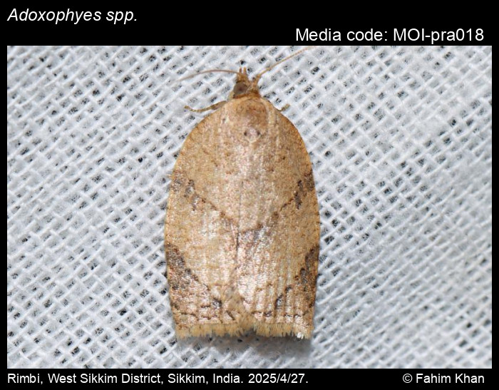 Pal, S. 2025. Adoxophyes spp. Meyrick, 1881 – . In Sondhi, S., R.P. Singh, G. Iyer, J. D'silva and K. Kunte (Chief Editors). Butterflies of India, v. 4.11. Published by the Indian Foundation for Butterflies. URL: https://www.mothsofindia.org/adoxophyes-spp, accessed 2025/10/28.