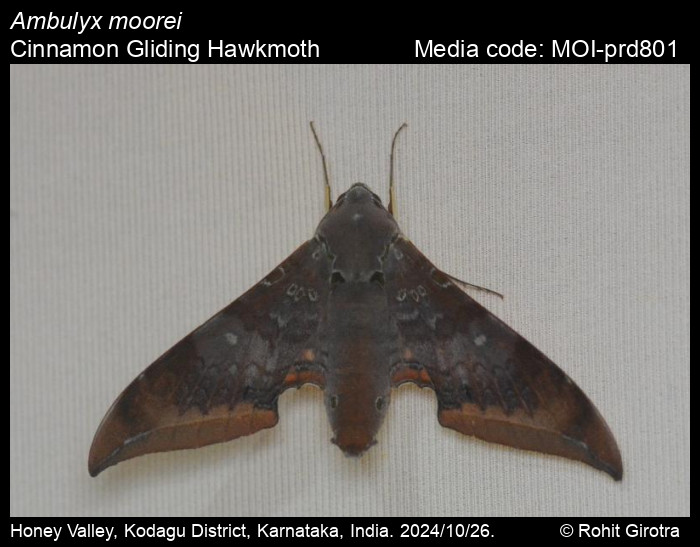 Anonymous 2026. Ambulyx moorei Moore, [1858] – Cinnamon Gliding Hawkmoth. In Sondhi, S., R.P. Singh, G. Iyer, J. D'silva and K. Kunte (Chief Editors). Butterflies of India, v. 4.11. Published by the Indian Foundation for Butterflies. URL: https://www.mothsofindia.org/ambulyx-moorei, accessed 2026/03/01.