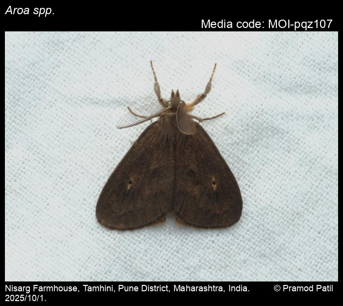 Anonymous 2025. Aroa spp. Walker, 1855 – . In Sondhi, S., R.P. Singh, G. Iyer, J. D'silva and K. Kunte (Chief Editors). Butterflies of India, v. 4.11. Published by the Indian Foundation for Butterflies. URL: https://www.mothsofindia.org/aroa-spp, accessed 2025/10/19.