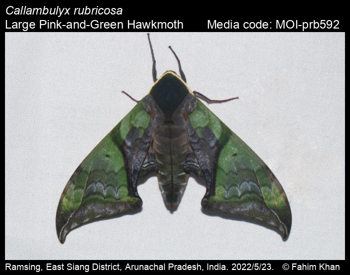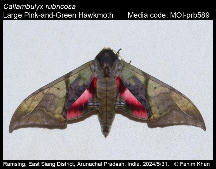 Anonymous 2026. Callambulyx rubricosa (Walker, 1856) – Large Pink-and-Green Hawkmoth. In Sondhi, S., R.P. Singh, G. Iyer, J. D'silva and K. Kunte (Chief Editors). Butterflies of India, v. 4.1. Published by the Indian Foundation for Butterflies. URL: https://www.mothsofindia.org/callambulyx-rubricosa, accessed 2026/01/02.
