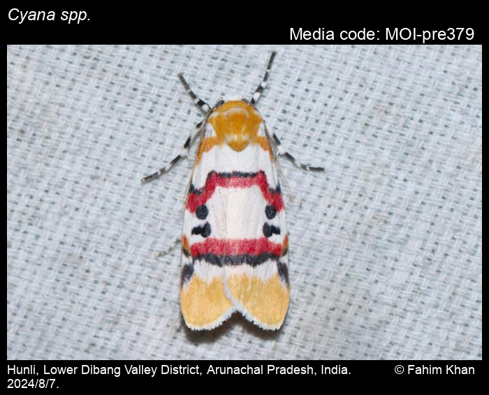 The genus Cyana consists of 42 species from India (Singh et al. 2020), with possibly more species awaiting description. This gallery of images titled Cyana spp., also contains some species that were traditionally classified as Cyana, but now have been transferred to other genera such as Kailasha, Nephelomilta, etc. In many species of Cyana, it is necessary to see the fore and hindwings of the species for a confirmed identification, which is difficult due to the normal sitting posture of this genus. In some cases, genitalia and/or barcoding are needed to separate species with certainty. If the individuals displayed on this page are identifed to the species level in the future, they will be moved to the respective species pages. We would welcome feedback from experts who are able to provide an insight into species identities. Comments and feedback on the page or specific images can be provided by using the link at the bottom of the page and by quoting the specific media code provided in the image.