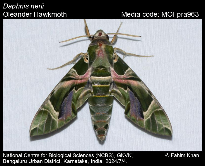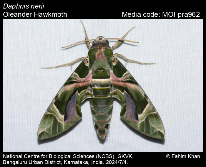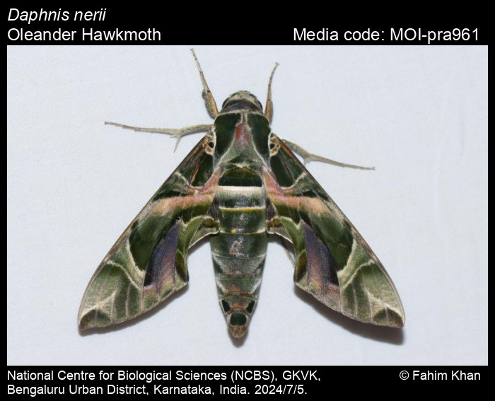 Anonymous 2025. Daphnis nerii (Linnaeus, 1758) – Oleander Hawkmoth. In Sondhi, S., R.P. Singh, G. Iyer, J. D'silva and K. Kunte (Chief Editors). Butterflies of India, v. 4.11. Published by the Indian Foundation for Butterflies. URL: https://www.mothsofindia.org/daphnis-nerii, accessed 2025/11/06.