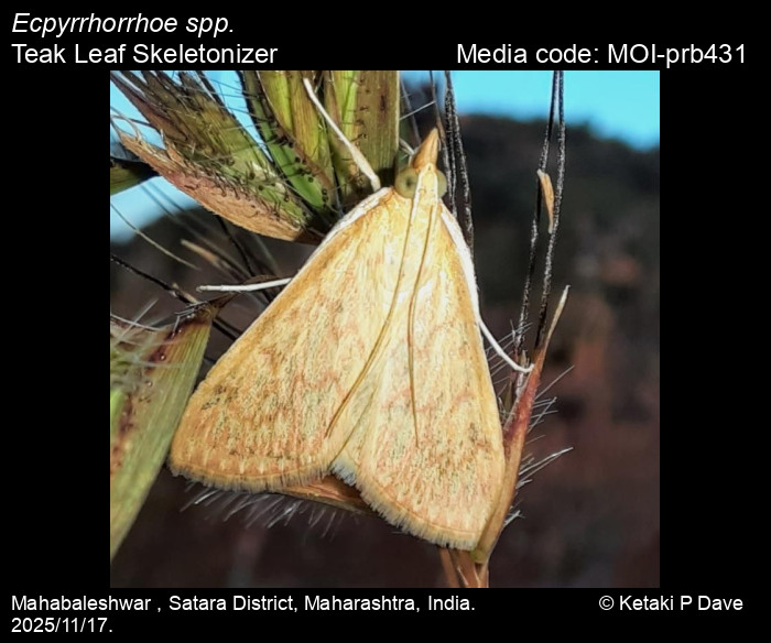 Anonymous 2026. Ecpyrrhorrhoe spp. Moore, 1886 – Teak Leaf Skeletonizer. In Sondhi, S., R.P. Singh, G. Iyer, J. D'silva and K. Kunte (Chief Editors). Butterflies of India, v. 4.1. Published by the Indian Foundation for Butterflies. URL: https://www.mothsofindia.org/Ecpyrrhorrhoe-spp, accessed 2026/01/07.