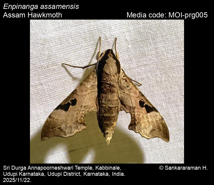 Anonymous 2026. Enpinanga assamensis (Walker, 1856) – Assam Hawkmoth. In Sondhi, S., R.P. Singh, G. Iyer, J. D'silva and K. Kunte (Chief Editors). Butterflies of India, v. 4.2. Published by the Indian Foundation for Butterflies. URL: https://www.mothsofindia.org/enpinanga-assamensis, accessed 2026/04/21.