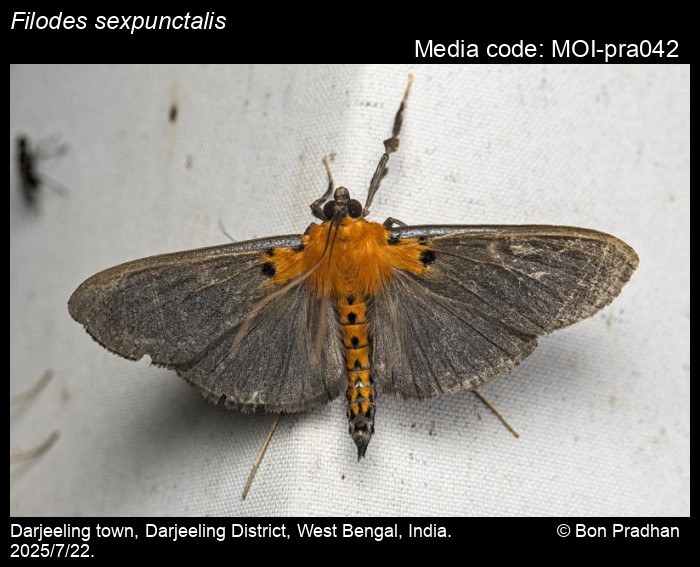 Anonymous 2025. Filodes sexpunctalis Snellen, 1890 – . In Sondhi, S., R.P. Singh, G. Iyer, J. D'silva and K. Kunte (Chief Editors). Butterflies of India, v. 4.11. Published by the Indian Foundation for Butterflies. URL: https://www.mothsofindia.org/filodes-sexpunctalis, accessed 2025/11/03.