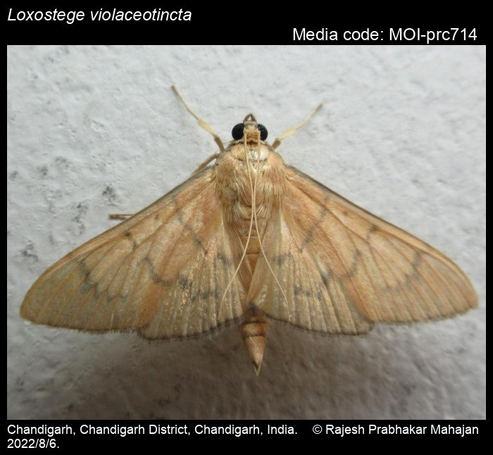 Anonymous 2026. Loxostege violaceotincta (Caradja, 1939) – . In Sondhi, S., R.P. Singh, G. Iyer, J. D'silva and K. Kunte (Chief Editors). Butterflies of India, v. 4.1. Published by the Indian Foundation for Butterflies. URL: https://www.mothsofindia.org/loxostege-violaceotincta, accessed 2026/01/31.