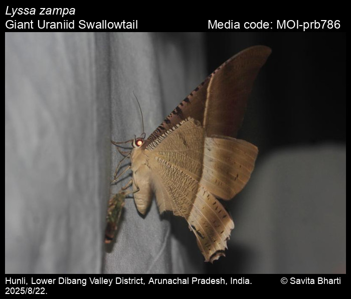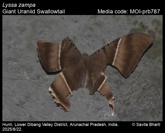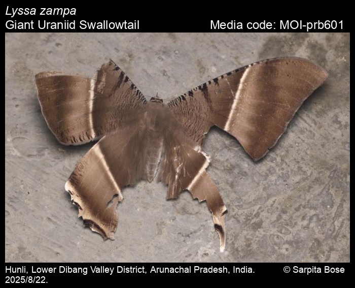Anonymous 2025. Lyssa zampa (Butler, 1869) – Giant Uraniid Swallowtail. In Sondhi, S., R.P. Singh, G. Iyer, J. D'silva and K. Kunte (Chief Editors). Butterflies of India, v. 4.1. Published by the Indian Foundation for Butterflies. URL: https://www.mothsofindia.org/lyssa-zampa, accessed 2025/12/31.