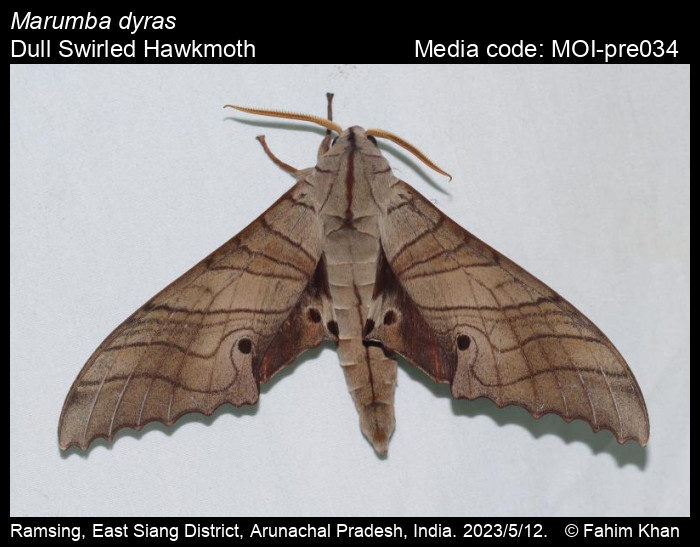 Anonymous 2026. Marumba dyras (Walker, 1856) – Dull Swirled Hawkmoth. In Sondhi, S., R.P. Singh, G. Iyer, J. D'silva and K. Kunte (Chief Editors). Butterflies of India, v. 4.11. Published by the Indian Foundation for Butterflies. URL: https://www.mothsofindia.org/marumba-dyras, accessed 2026/02/15.