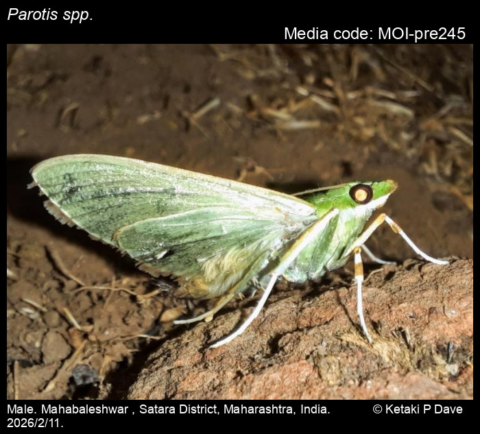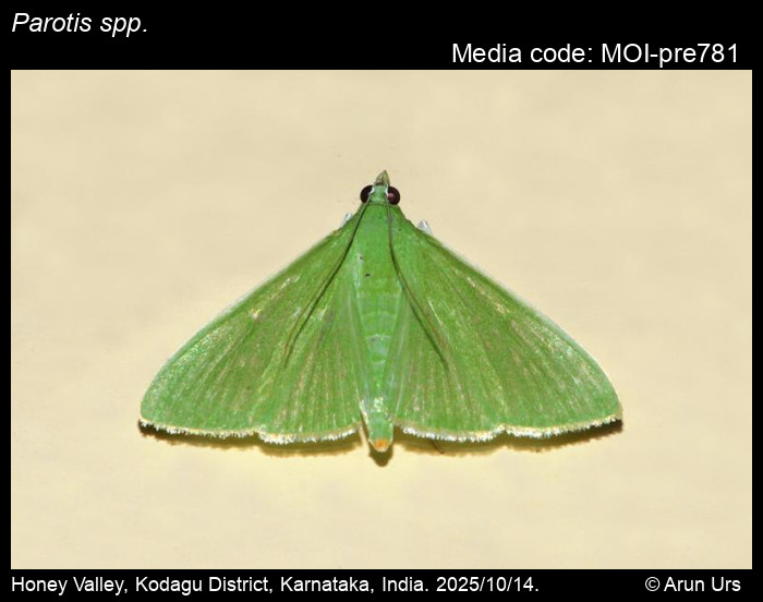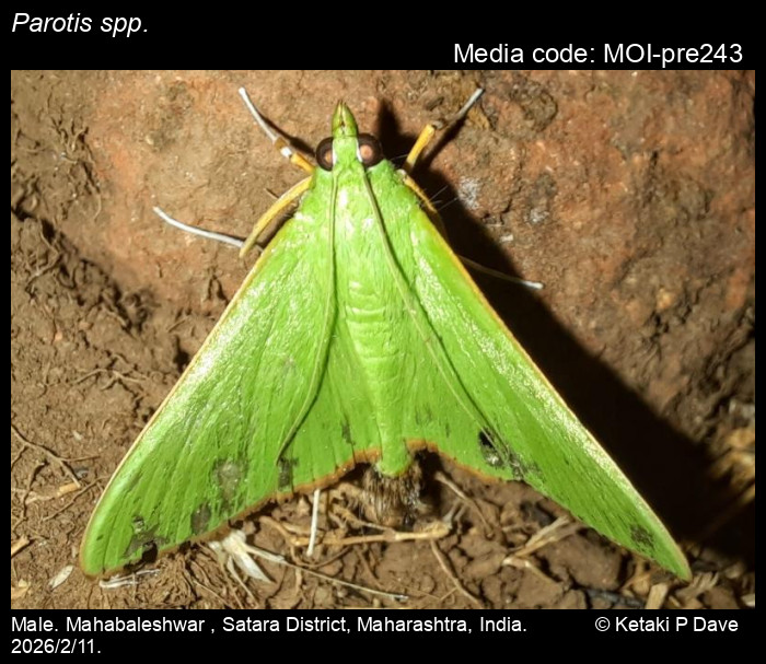 Numerous species of Parotis Hübner, 1831 are known from India. Parotis species are difficult to identify from images only, and need examination of male genitalia and/or molecular phylogeny. Hence, species level identities are difficult using photographs only. This page shows a gallery of Parotis spp. if these individuals are identified to the species level in the future, they will be moved to the respective species pages. We would welcome feedback from experts who are able to provide an insight into species identities. Comments and feedback on the page or specific images can be provided by using the link at the bottom of the page and by quoting the specific media code provided in the image.