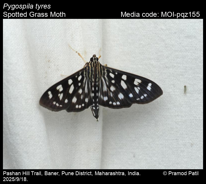 Anonymous 2025. Pygospila tyres (Cramer, [1780]) – Spotted Grass Moth. In Sondhi, S., R.P. Singh, G. Iyer, J. D'silva and K. Kunte (Chief Editors). Butterflies of India, v. 4.11. Published by the Indian Foundation for Butterflies. URL: https://www.mothsofindia.org/pygospila-tyres, accessed 2025/10/23.