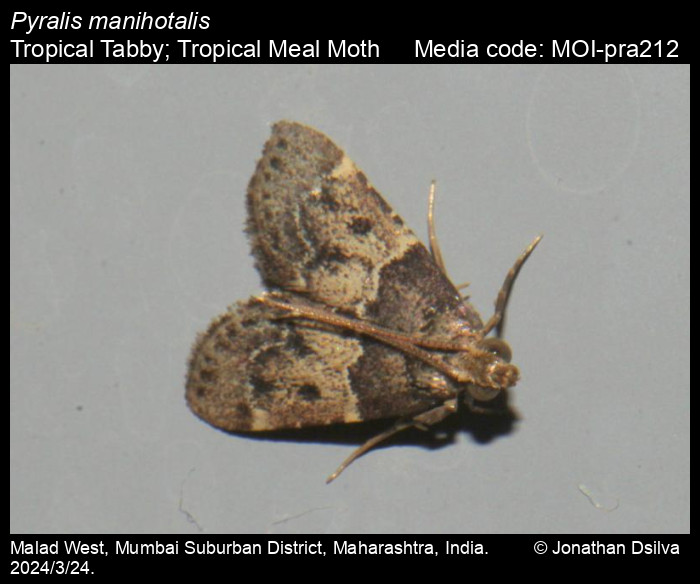 Anonymous 2025. Pyralis manihotalis Guenée, 1854 – Tropical Tabby; Tropical Meal Moth. In Sondhi, S., R.P. Singh, G. Iyer, J. D'silva and K. Kunte (Chief Editors). Butterflies of India, v. 4.11. Published by the Indian Foundation for Butterflies. URL: https://www.mothsofindia.org/pyralis-manihotalis, accessed 2025/10/30.