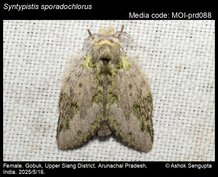 Notes: This species belongs to the Syntypistis parcevirens group. Provisionally identified as Syntypistis sporadochlorus (Bryk, 1949) by A. Schintlmeister (pers. comm. Sanjay Sondhi). Syntypistis sporadochlorus was previously considered a junior synonym of S. parcevirens (Schintlmeister 2008). The two species are best separated by examining male genitalia.