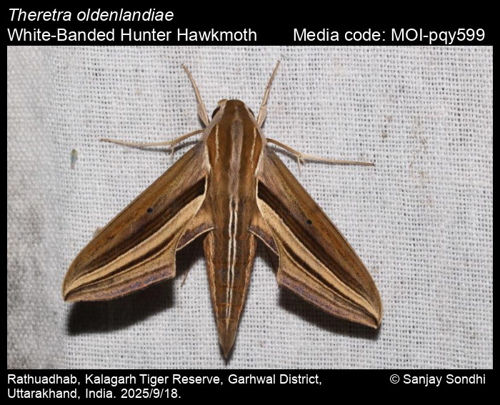 Anonymous 2025. Theretra oldenlandiae (Fabricius, 1775) – White-Banded Hunter Hawkmoth. In Sondhi, S., R.P. Singh, G. Iyer, J. D'silva and K. Kunte (Chief Editors). Butterflies of India, v. 4.11. Published by the Indian Foundation for Butterflies. URL: https://www.mothsofindia.org/theretra-oldenlandiae, accessed 2025/10/14.