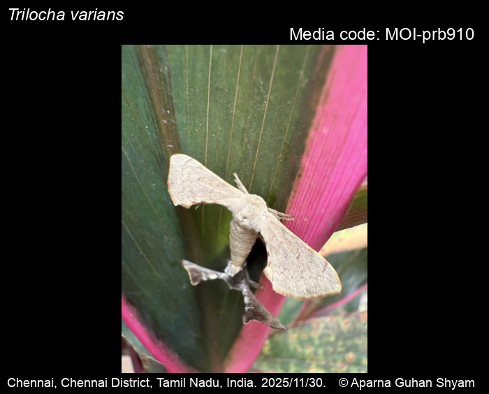 Trilocha varians Walker, 1855: Artocarpus integer, Ficus racemosa, Ficus religiosa, Ficus drupacea, Streblus asper (Moraceae) (Robinson et al. 2010).Ficus elastica, Ficus religiosa. It is a pest for these two species of Ficus.