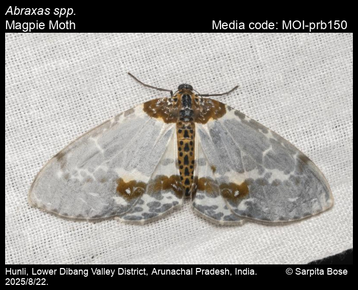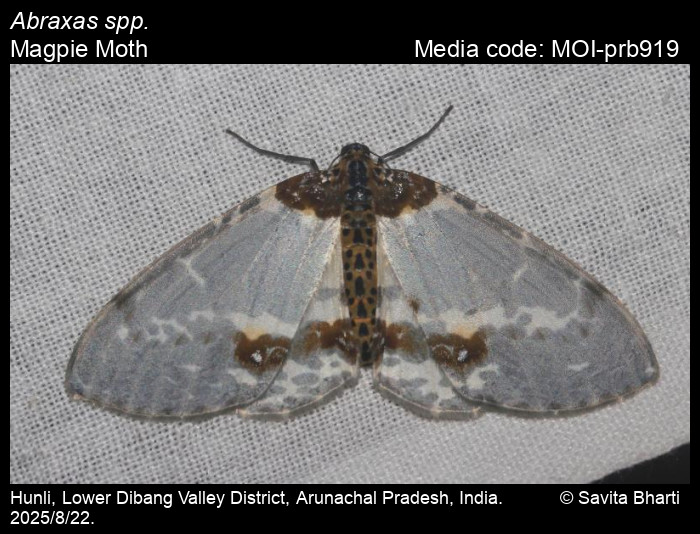Anonymous 2025. Abraxas spp. Leach, 1815 – Magpie Moth. In Sondhi, S., R.P. Singh, G. Iyer, J. D'silva and K. Kunte (Chief Editors). Butterflies of India, v. 4.1. Published by the Indian Foundation for Butterflies. URL: https://www.mothsofindia.org/abraxas-spp, accessed 2025/12/26.