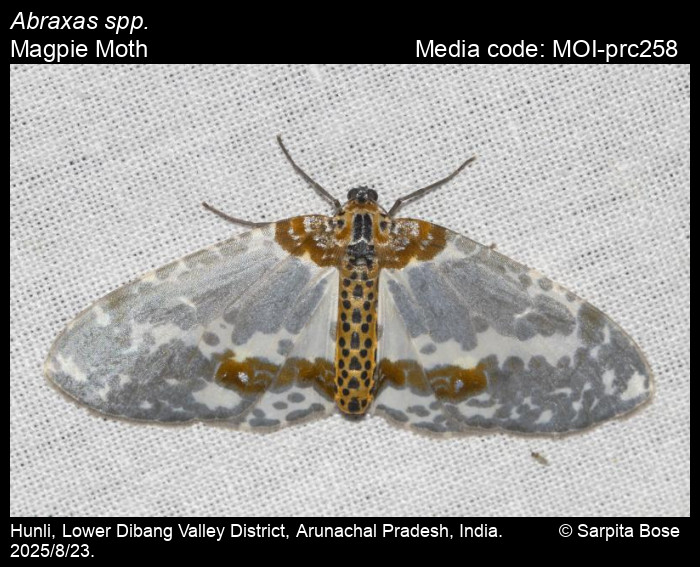 Anonymous 2026. Abraxas spp. Leach, 1815 – Magpie Moth. In Sondhi, S., R.P. Singh, G. Iyer, J. D'silva and K. Kunte (Chief Editors). Butterflies of India, v. 4.1. Published by the Indian Foundation for Butterflies. URL: https://www.mothsofindia.org/abraxas-spp, accessed 2026/01/02.