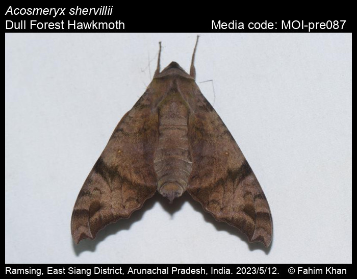 Anonymous 2026. Acosmeryx shervillii Boisduval, [1875] – Dull Forest Hawkmoth. In Sondhi, S., R.P. Singh, G. Iyer, J. D'silva and K. Kunte (Chief Editors). Butterflies of India, v. 4.11. Published by the Indian Foundation for Butterflies. URL: https://www.mothsofindia.org/acosmeryx-shervillii, accessed 2026/02/28.