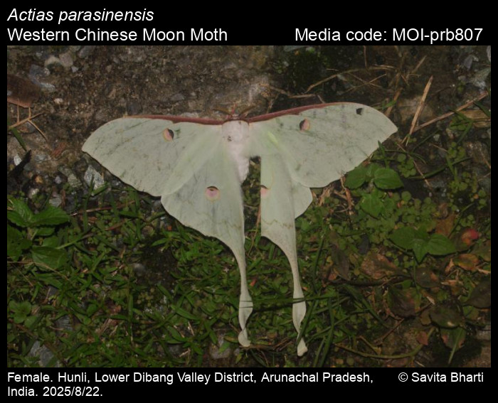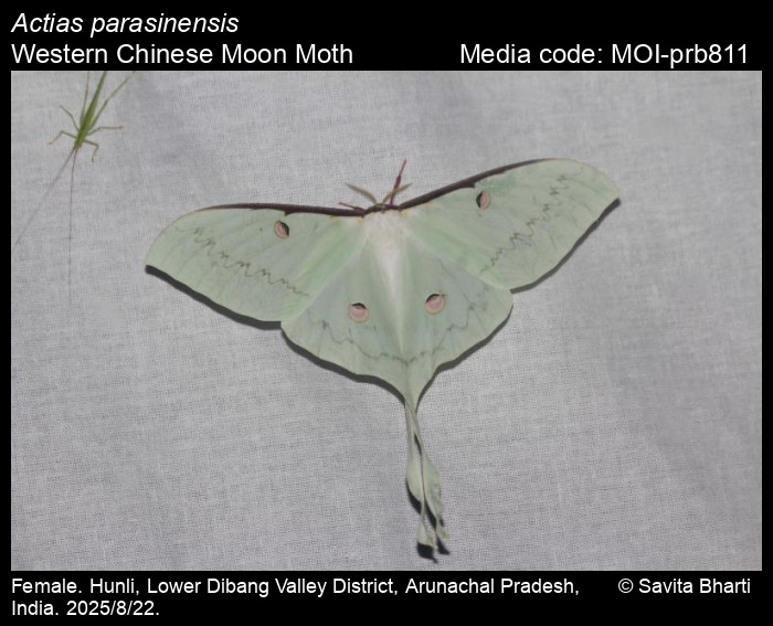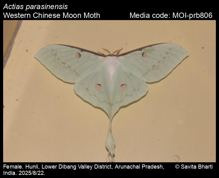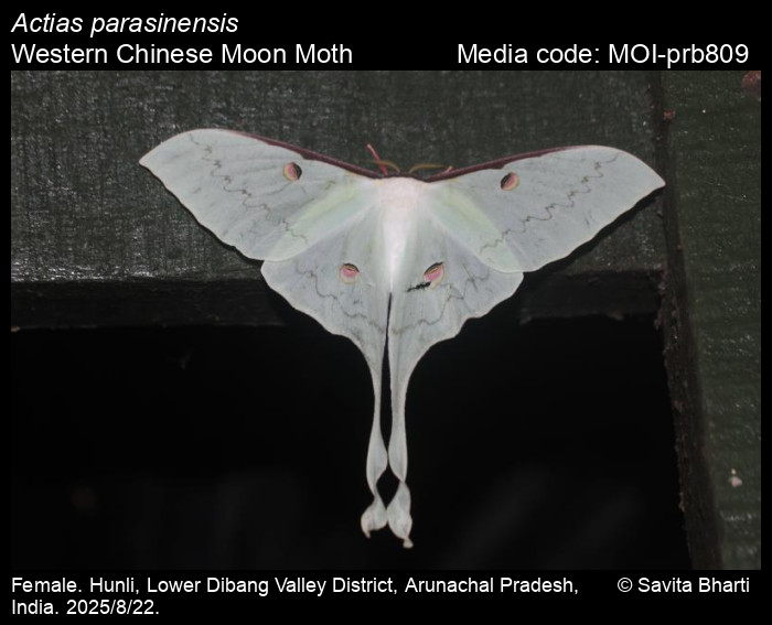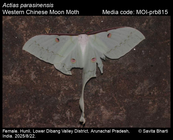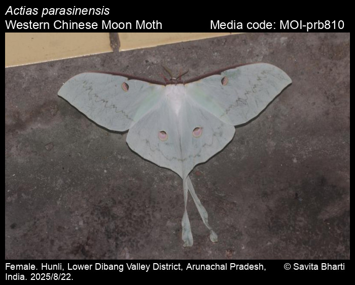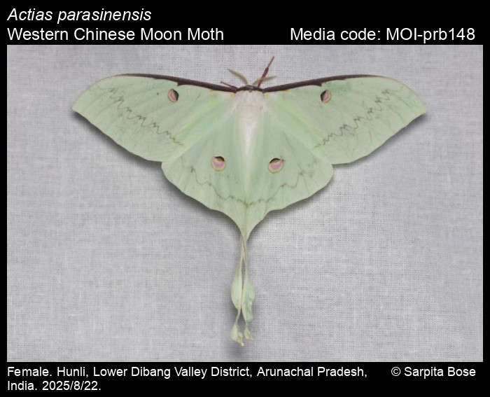 Anonymous 2025. Actias parasinensis Brechlin, 2009 – Western Chinese Moon Moth. In Sondhi, S., R.P. Singh, G. Iyer, J. D'silva and K. Kunte (Chief Editors). Butterflies of India, v. 4.1. Published by the Indian Foundation for Butterflies. URL: https://www.mothsofindia.org/actias-parasinensis, accessed 2025/12/06.