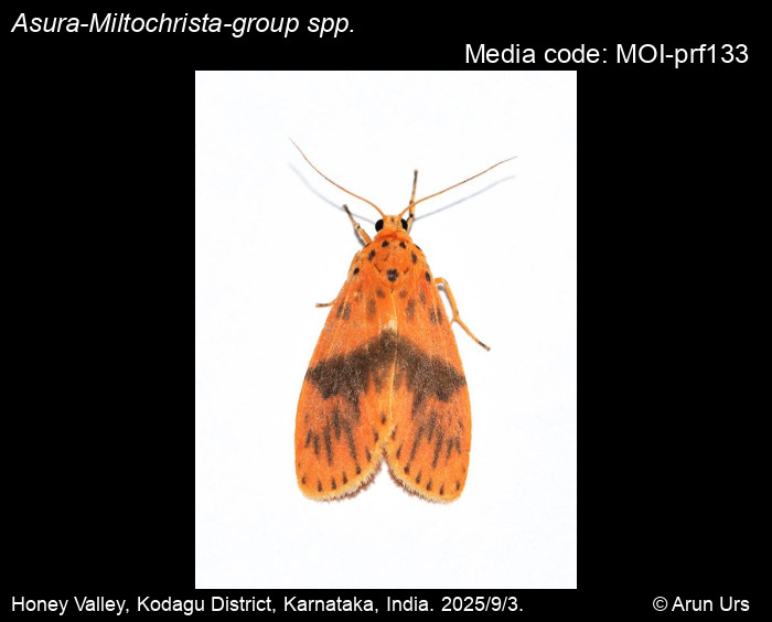 Note: Vide Volynkin et al. 2019, a number of groups of species considered previously by various authors as members of Asura and Miltochrista Hübner, [1819] were erected  to 20 new genera and four subgenera. On this page, the similar-looking generic groups found in the Indian subregion, such as Aberrasine Volynkin & Huang, 2019, Argentosine Volynkin, 2019, Asura Walker, 1854, Barsura Volynkin, Dubatolov & Kishida, 2017, Barsaurea Volynkin & Huang, 2019, Hampsonascia Volynkin, 2019, Miltochrista Hübner, [1819], Ovipennis Hampson, 1900, Pseudobarsine Singh & Kirti, 2016 are currently "dumped" in the Asura-Miltochrista-group spp., till they can be separated into specific genera or species.