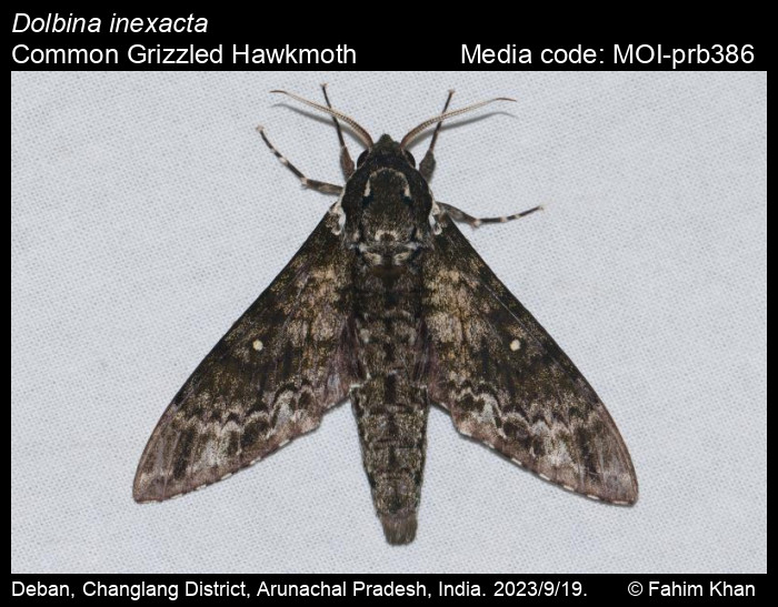 Anonymous 2025. Dolbina inexacta (Walker, 1856) – Common Grizzled Hawkmoth. In Sondhi, S., R.P. Singh, G. Iyer, J. D'silva and K. Kunte (Chief Editors). Butterflies of India, v. 4.1. Published by the Indian Foundation for Butterflies. URL: https://www.mothsofindia.org/dolbina-inexacta, accessed 2025/12/07.