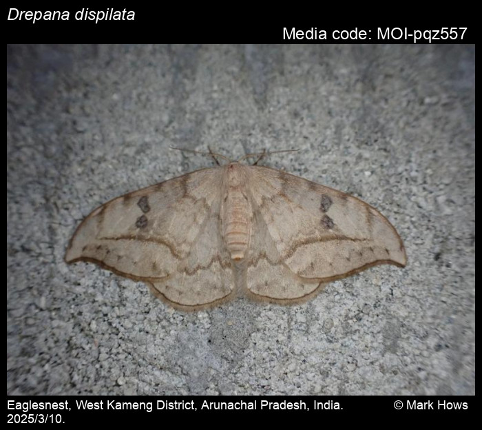 Anonymous 2025. Drepana dispilata Warren, 1922 – . In Sondhi, S., R.P. Singh, G. Iyer, J. D'silva and K. Kunte (Chief Editors). Butterflies of India, v. 4.11. Published by the Indian Foundation for Butterflies. URL: https://www.mothsofindia.org/drepana-dispilata, accessed 2025/10/17.