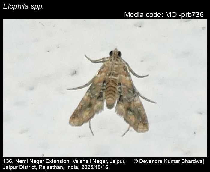 Anonymous 2026. Elophila spp. Hübner, 1822 – . In Sondhi, S., R.P. Singh, G. Iyer, J. D'silva and K. Kunte (Chief Editors). Butterflies of India, v. 4.1. Published by the Indian Foundation for Butterflies. URL: https://www.mothsofindia.org/elophila-spp, accessed 2026/01/30.