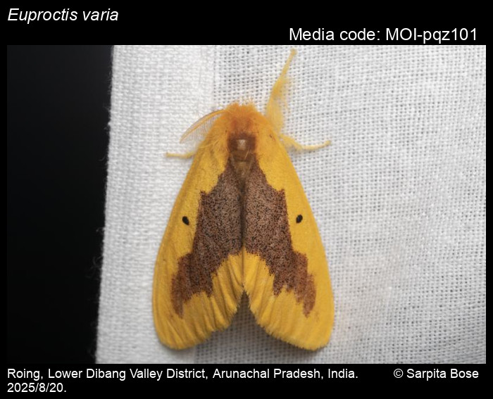 Euproctis varia Walker, 1855. India: Uttarakhand, Himachal Pradesh, Arunachal Pradesh, Sikkim, Meghalaya.