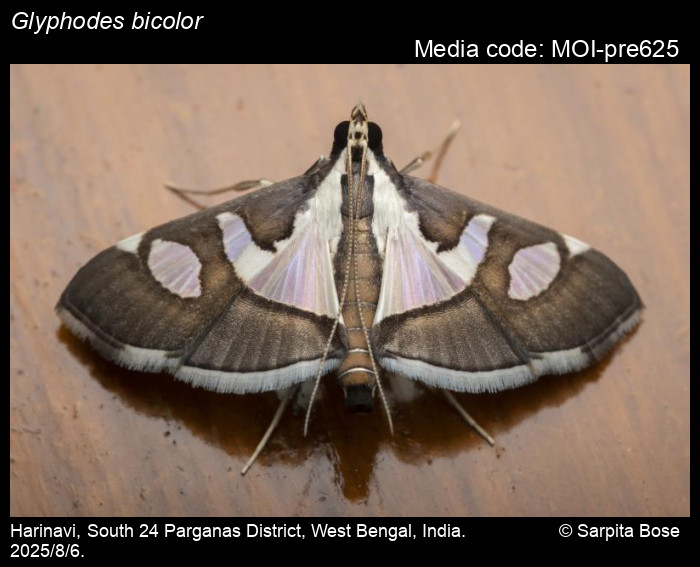 Anonymous 2026. Glyphodes bicolor (Swainson, 1821) – . In Sondhi, S., R.P. Singh, G. Iyer, J. D'silva and K. Kunte (Chief Editors). Butterflies of India, v. 4.11. Published by the Indian Foundation for Butterflies. URL: https://www.mothsofindia.org/glyphodes-bicolor, accessed 2026/03/14.