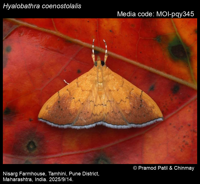 Anonymous 2025. Hyalobathra coenostolalis (Snellen, 1890) – . In Sondhi, S., R.P. Singh, G. Iyer, J. D'silva and K. Kunte (Chief Editors). Butterflies of India, v. 4.11. Published by the Indian Foundation for Butterflies. URL: https://www.mothsofindia.org/hyalobathra-coenostolalis, accessed 2025/10/21.