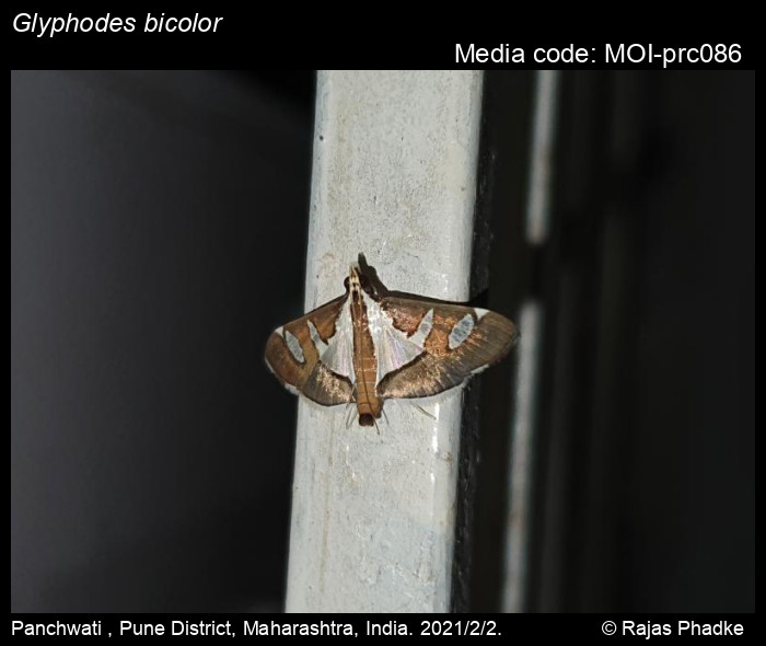 Anonymous 2026. Glyphodes bicolor (Swainson, 1821) – . In Sondhi, S., R.P. Singh, G. Iyer, J. D'silva and K. Kunte (Chief Editors). Butterflies of India, v. 4.1. Published by the Indian Foundation for Butterflies. URL: https://www.mothsofindia.org/index.php/glyphodes-bicolor, accessed 2026/01/13.