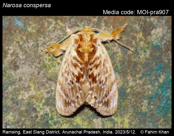 Anonymous 2025. Narosa conspersa Walker, 1855 – . In Sondhi, S., R.P. Singh, G. Iyer, J. D'silva and K. Kunte (Chief Editors). Butterflies of India, v. 4.11. Published by the Indian Foundation for Butterflies. URL: https://www.mothsofindia.org/index.php/narosa-conspersa, accessed 2025/11/09.
