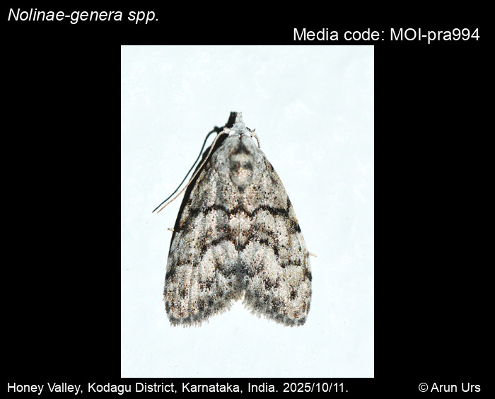 Anonymous 2025. Nolinae-genera spp. Bruand, 1846 – . In Sondhi, S., R.P. Singh, G. Iyer, J. D'silva and K. Kunte (Chief Editors). Butterflies of India, v. 4.11. Published by the Indian Foundation for Butterflies. URL: https://www.mothsofindia.org/index.php/nolinae-genera-spp, accessed 2025/11/08.