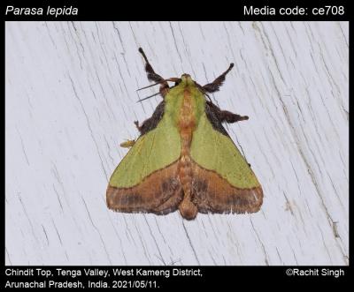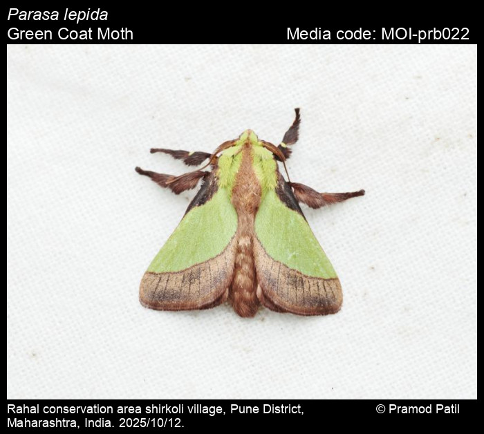 Anonymous. 2025. Parasa lepida (Cramer, 1799) – Green Coat Moth. In Sondhi, S., R.P. Singh, G. Iyer, J. D'silva and K. Kunte (Chief Editors). Butterflies of India, v. 4.11. Published by the Indian Foundation for Butterflies. URL: https://www.mothsofindia.org/index.php/parasa-lepida, accessed 2025/11/08.