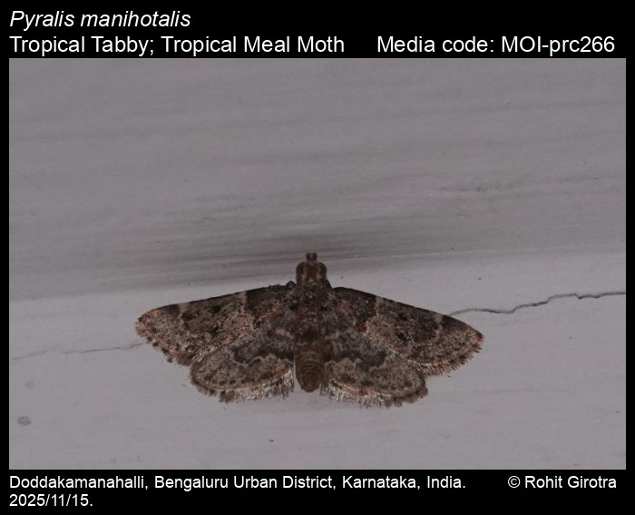 Anonymous 2026. Pyralis manihotalis Guenée, 1854 – Tropical Tabby; Tropical Meal Moth. In Sondhi, S., R.P. Singh, G. Iyer, J. D'silva and K. Kunte (Chief Editors). Butterflies of India, v. 4.1. Published by the Indian Foundation for Butterflies. URL: https://www.mothsofindia.org/index.php/pyralis-manihotalis, accessed 2026/01/13.