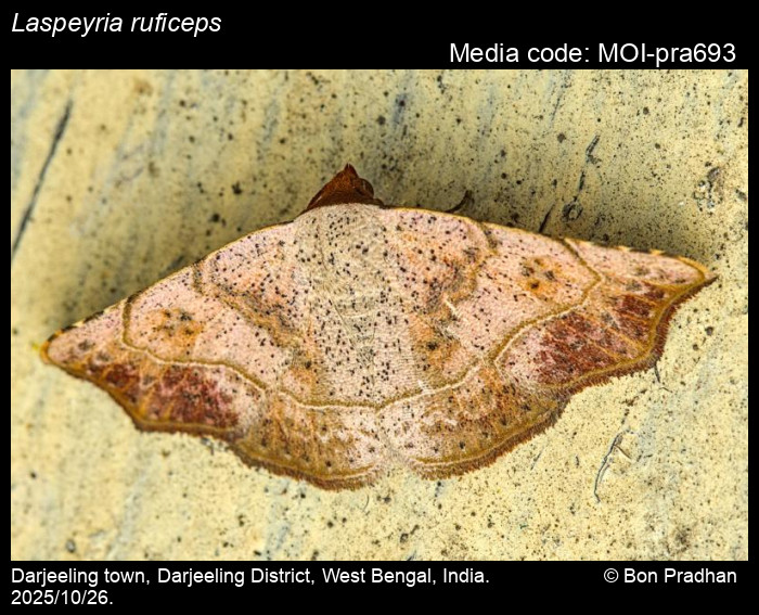 Note: Its is likely the specimen codes cq899, cr115 and cr116, all from NE India, represent a different species of Laspeyria and have the following differences from traditional ruficeps from peneninsular India: wings heavily tinged with pink, forewing more deeply excised near apex and not evenly curved, but oblique in the middle, and the antemedial being broader than ruficeps.