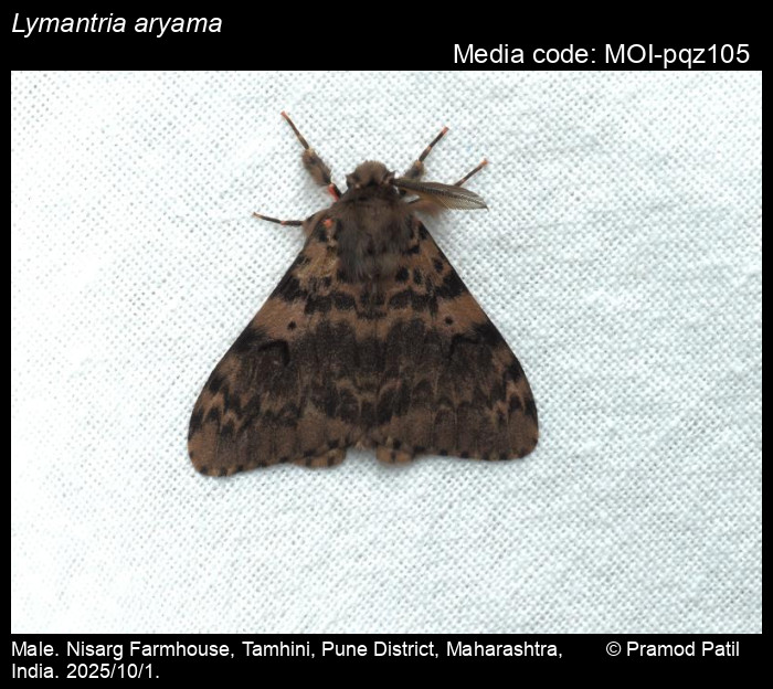 Anonymous 2025. Lymantria aryama Moore, 1859 – . In Sondhi, S., R.P. Singh, G. Iyer, J. D'silva and K. Kunte (Chief Editors). Butterflies of India, v. 4.11. Published by the Indian Foundation for Butterflies. URL: https://www.mothsofindia.org/lymantria-aryama, accessed 2025/10/13.