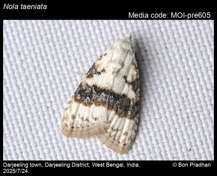 Anonymous 2026. Nola taeniata Snellen, 1875 – . In Sondhi, S., R.P. Singh, G. Iyer, J. D'silva and K. Kunte (Chief Editors). Butterflies of India, v. 4.11. Published by the Indian Foundation for Butterflies. URL: https://www.mothsofindia.org/nola-taeniata, accessed 2026/02/26.