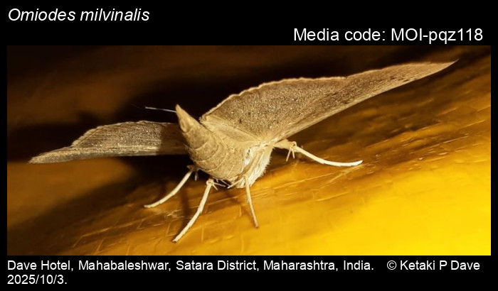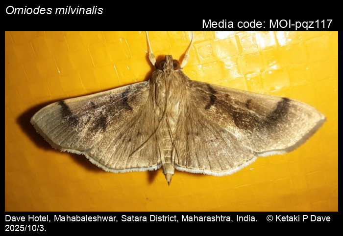 Anonymous 2025. Omiodes milvinalis (Swinhoe, [1886]) – . In Sondhi, S., R.P. Singh, G. Iyer, J. D'silva and K. Kunte (Chief Editors). Butterflies of India, v. 4.11. Published by the Indian Foundation for Butterflies. URL: https://www.mothsofindia.org/omiodes-milvinalis, accessed 2025/11/04.