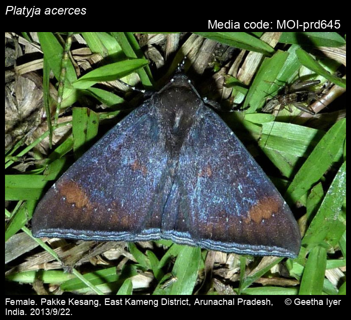 Anonymous 2026. Platyja acerces (Prout, 1928) – . In Sondhi, S., R.P. Singh, G. Iyer, J. D'silva and K. Kunte (Chief Editors). Butterflies of India, v. 4.11. Published by the Indian Foundation for Butterflies. URL: https://www.mothsofindia.org/platyja-acerces, accessed 2026/02/06.