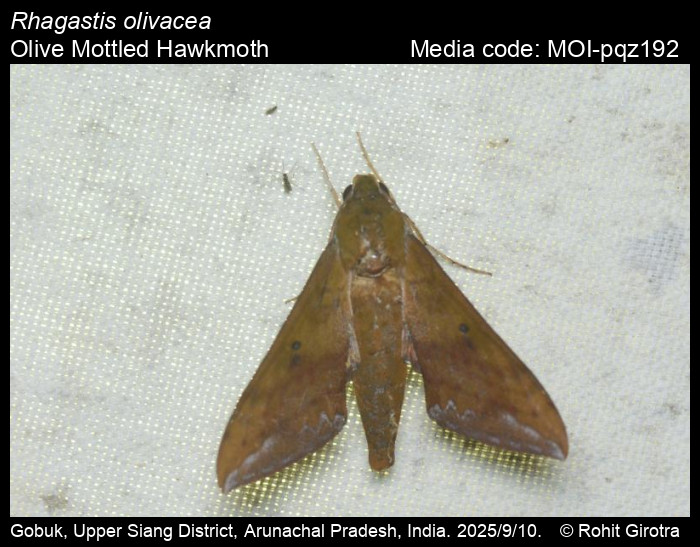 Anonymous 2025. Rhagastis olivacea (Moore, 1872) – Olive Mottled Hawkmoth. In Sondhi, S., R.P. Singh, G. Iyer, J. D'silva and K. Kunte (Chief Editors). Butterflies of India, v. 4.11. Published by the Indian Foundation for Butterflies. URL: https://www.mothsofindia.org/rhagastis-olivacea, accessed 2025/10/19.