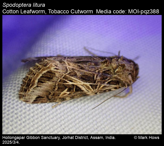 Anonymous 2025. Spodoptera litura (Fabricius, 1775) – Cotton Leafworm, Tobacco Cutworm. In Sondhi, S., R.P. Singh, G. Iyer, J. D'silva and K. Kunte (Chief Editors). Butterflies of India, v. 4.11. Published by the Indian Foundation for Butterflies. URL: https://www.mothsofindia.org/spodoptera-litura, accessed 2025/10/21.
