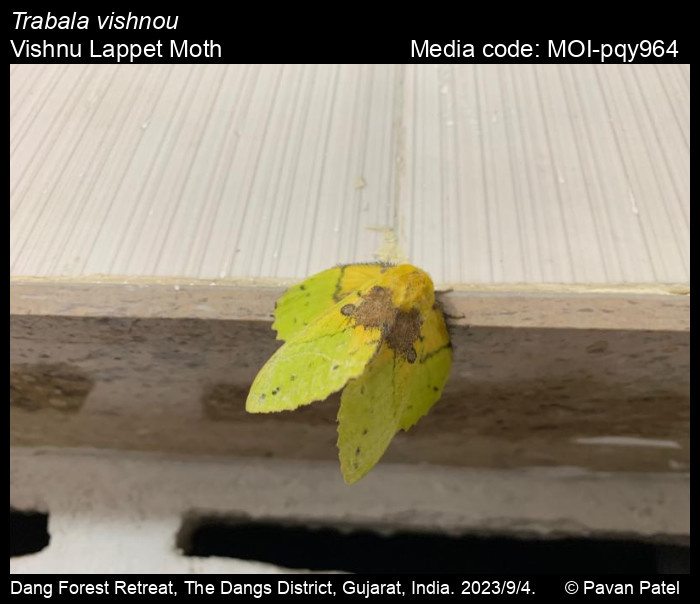 Anonymous 2025. Trabala vishnou (Lefèbvre, 1827) – Vishnu Lappet Moth. In Sondhi, S., R.P. Singh, G. Iyer, J. D'silva and K. Kunte (Chief Editors). Butterflies of India, v. 4.11. Published by the Indian Foundation for Butterflies. URL: https://www.mothsofindia.org/trabala-vishnou, accessed 2025/10/23.